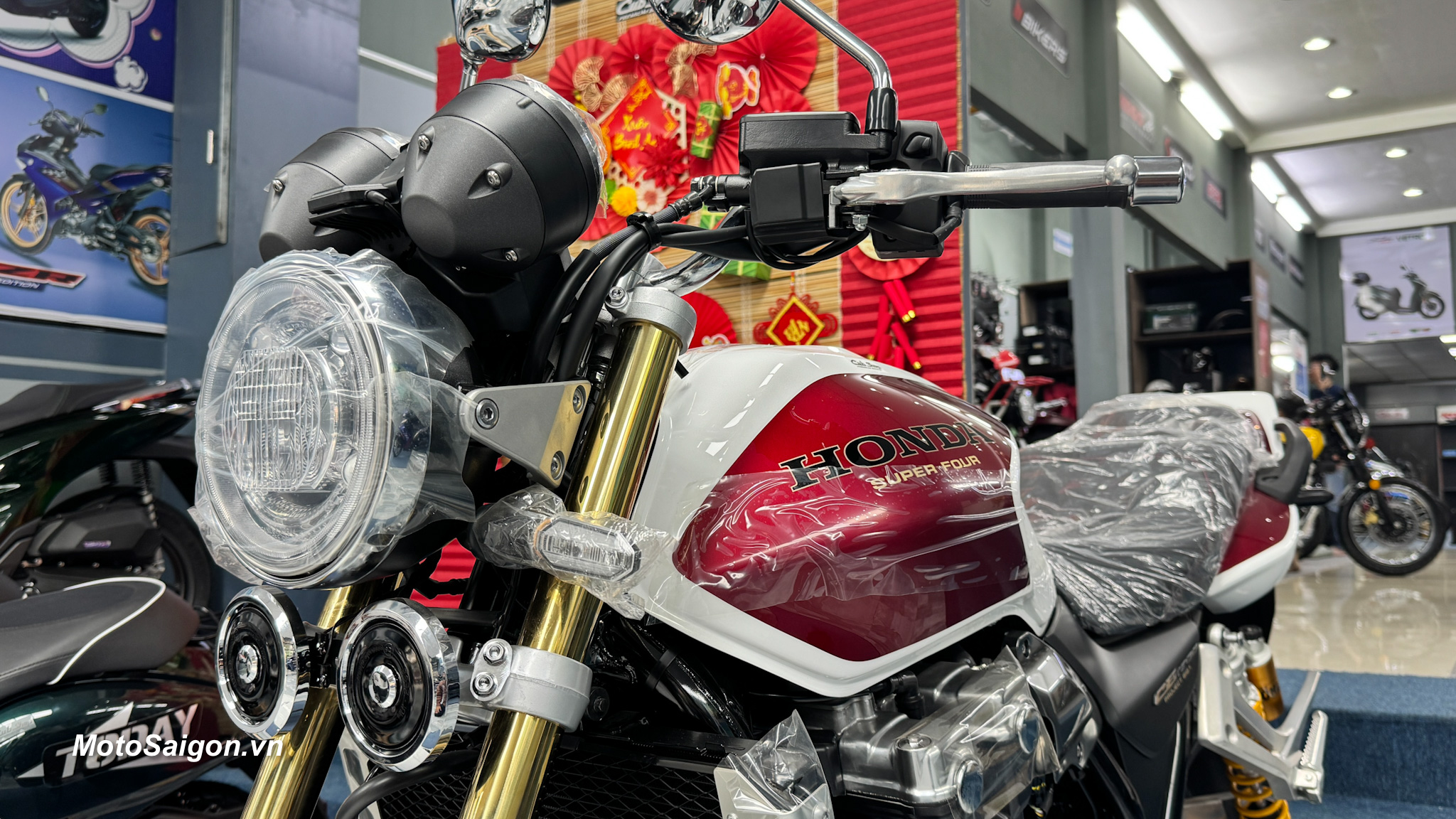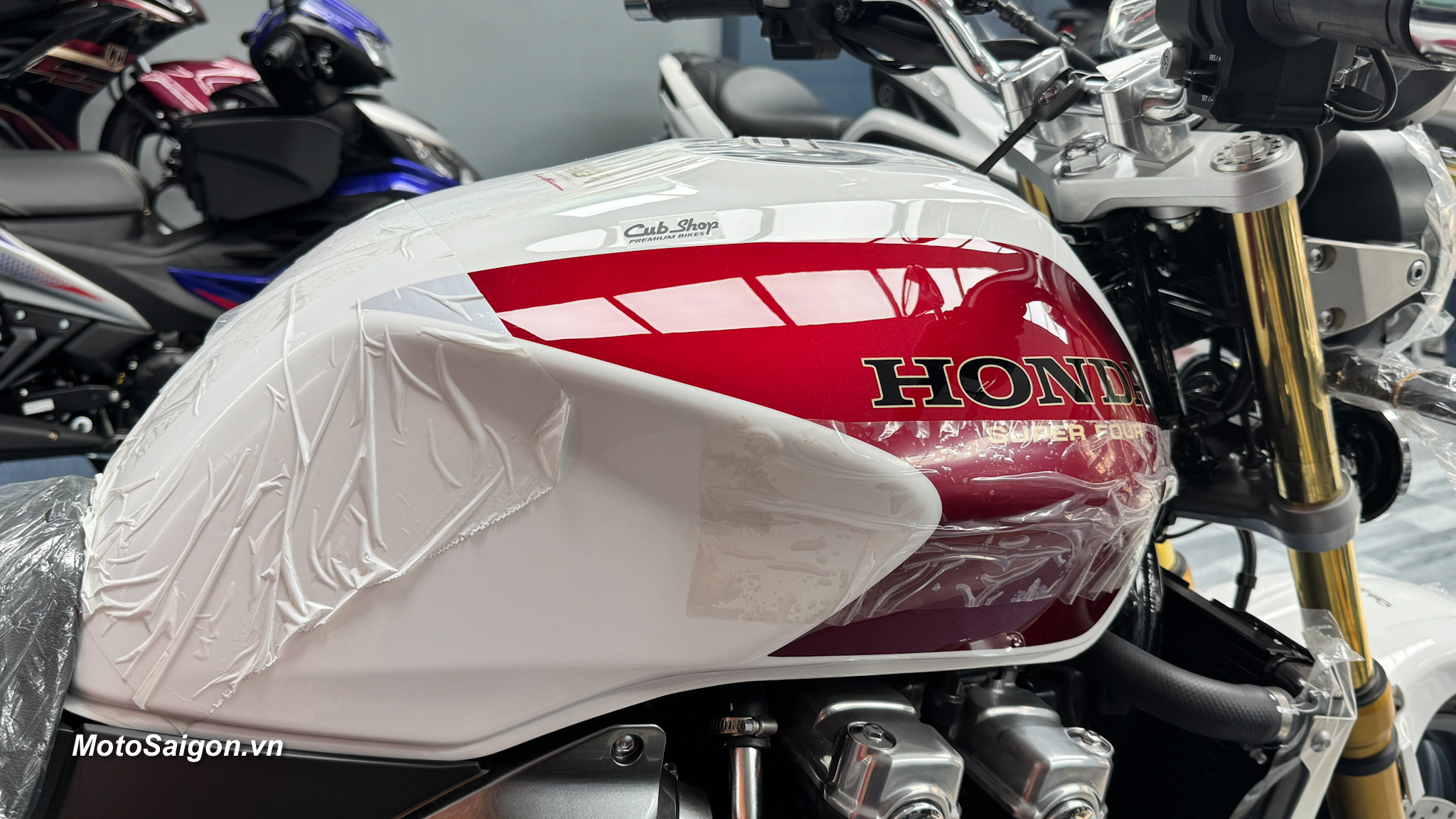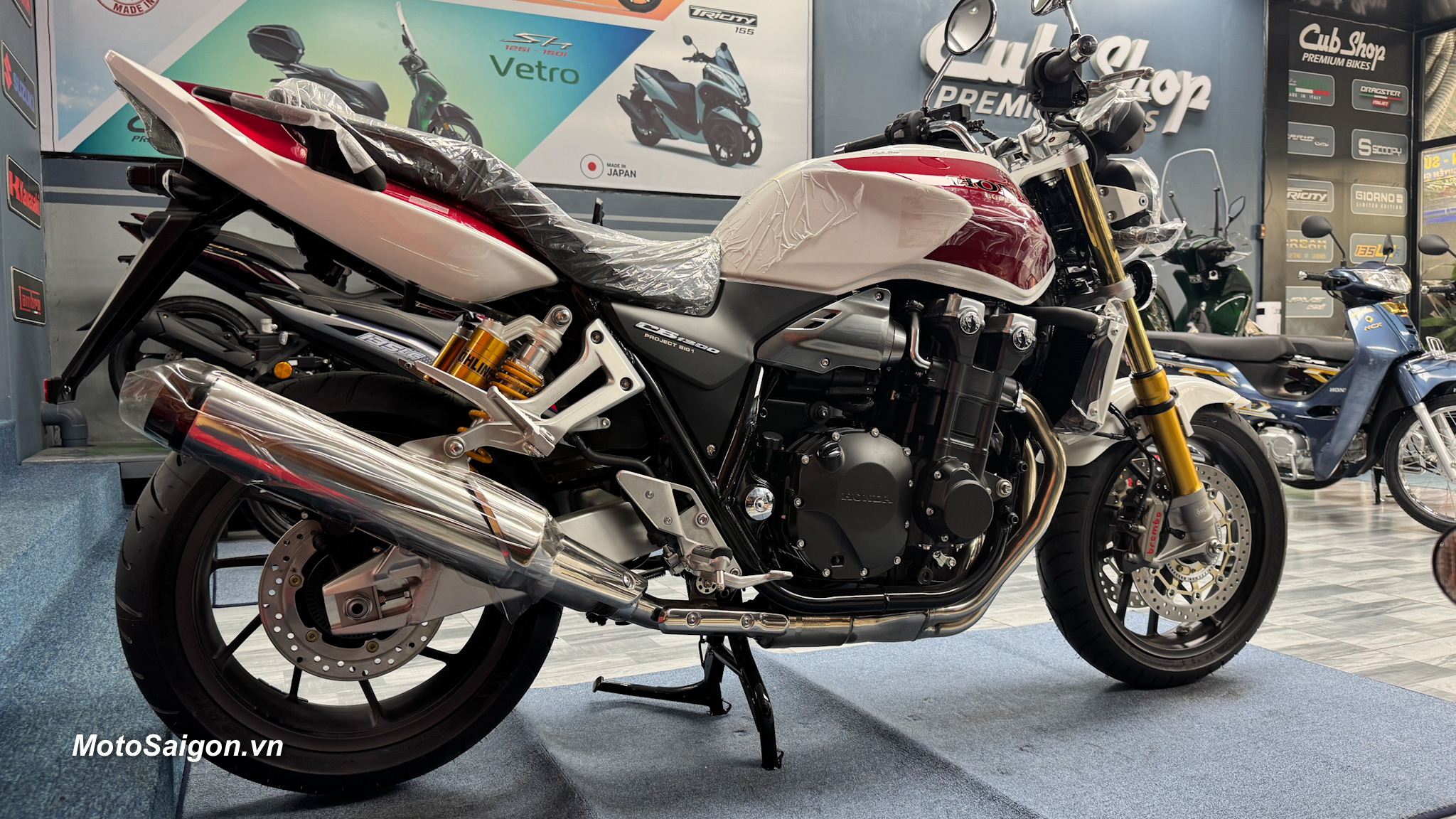 Màu sơn kinh điển: Phối màu Pearl Sunbeam White (Trắng – Đỏ) lấy cảm hứng trực tiếp từ chiếc CB1000SF đời 1992, kết hợp với khung xe sơn đỏ và mâm xe màu vàng đồng cực kỳ sang trọng.