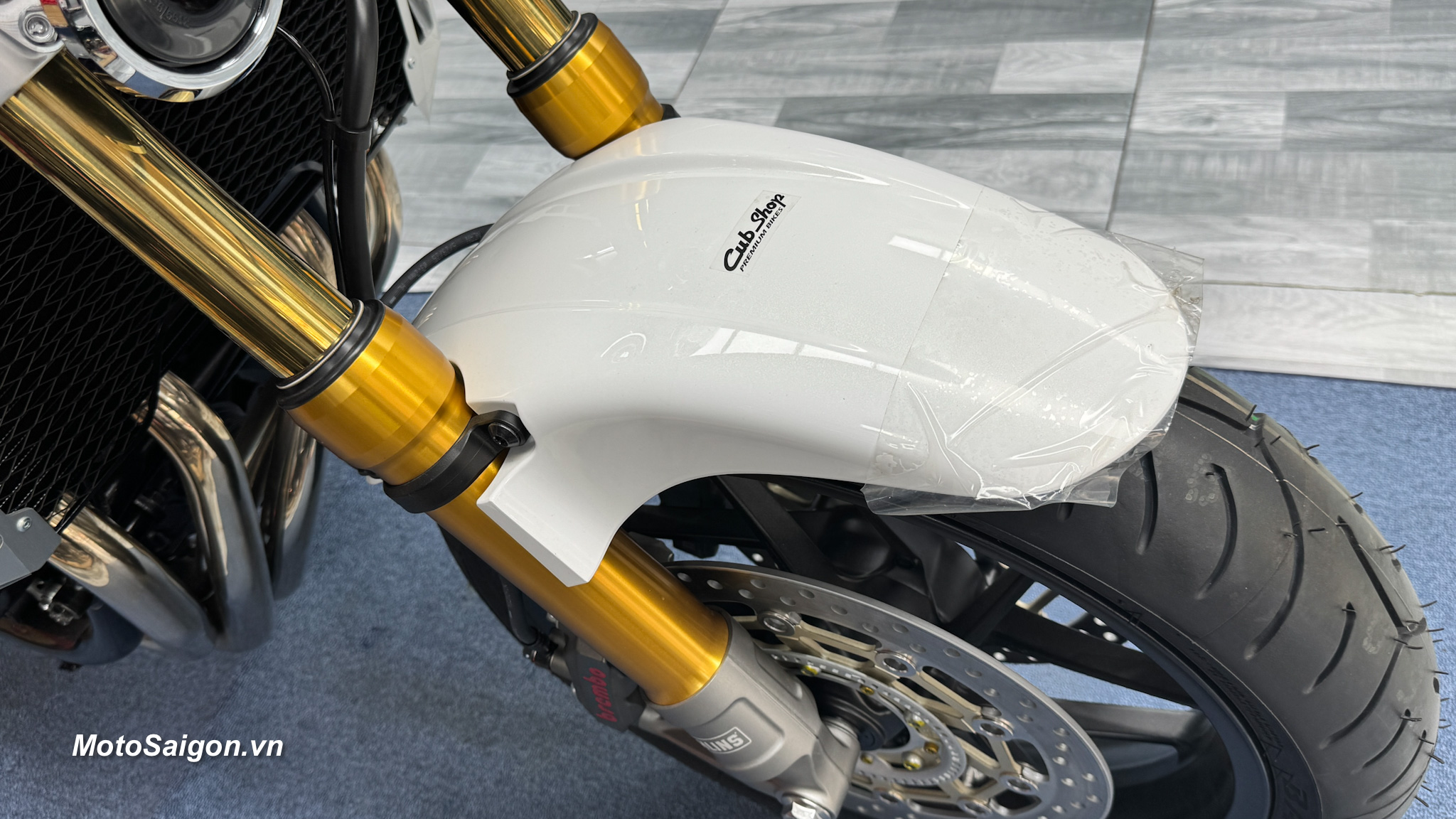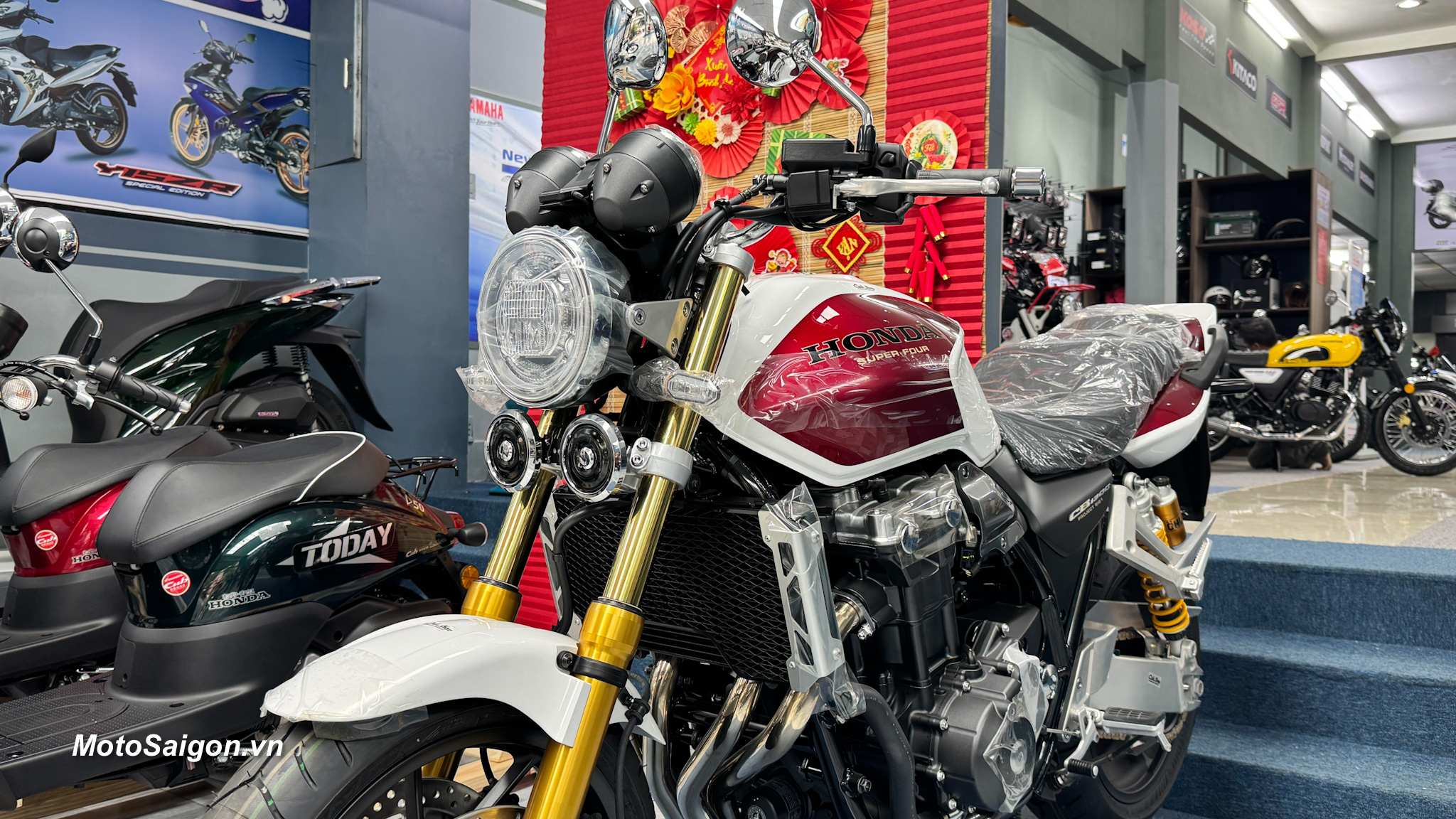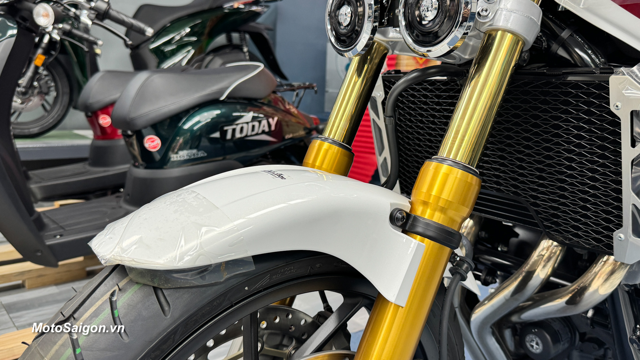 Màu sơn kinh điển: Phối màu Pearl Sunbeam White (Trắng – Đỏ) lấy cảm hứng trực tiếp từ chiếc CB1000SF đời 1992, kết hợp với khung xe sơn đỏ và mâm xe màu vàng đồng cực kỳ sang trọng.