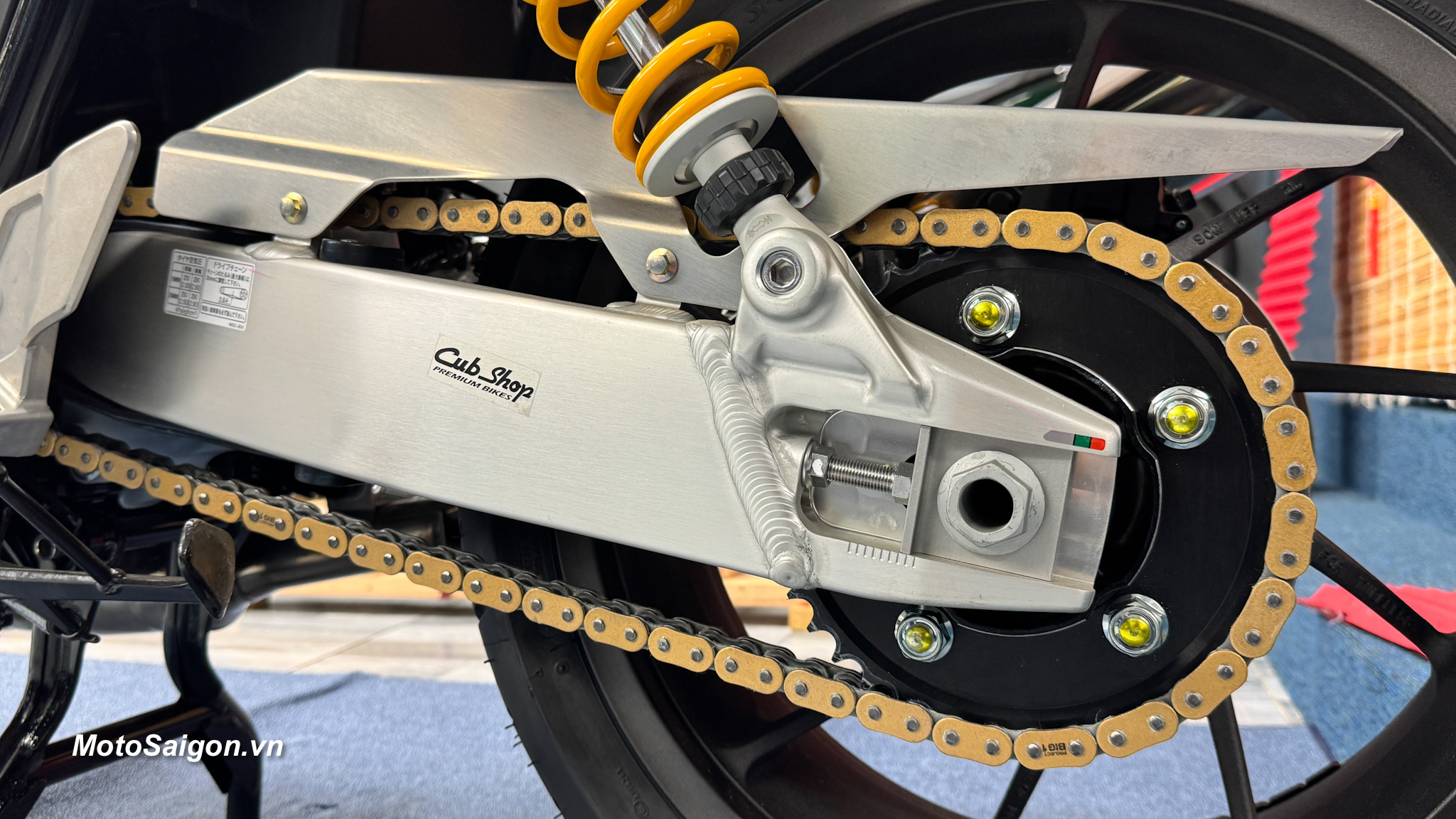 Hoàn thiện cao cấp: Các chi tiết như chảng ba và tay đòn (swingarm) được sơn bạc mờ tinh xảo, tạo độ tương phản mạnh mẽ với lốc máy đen truyền thống.