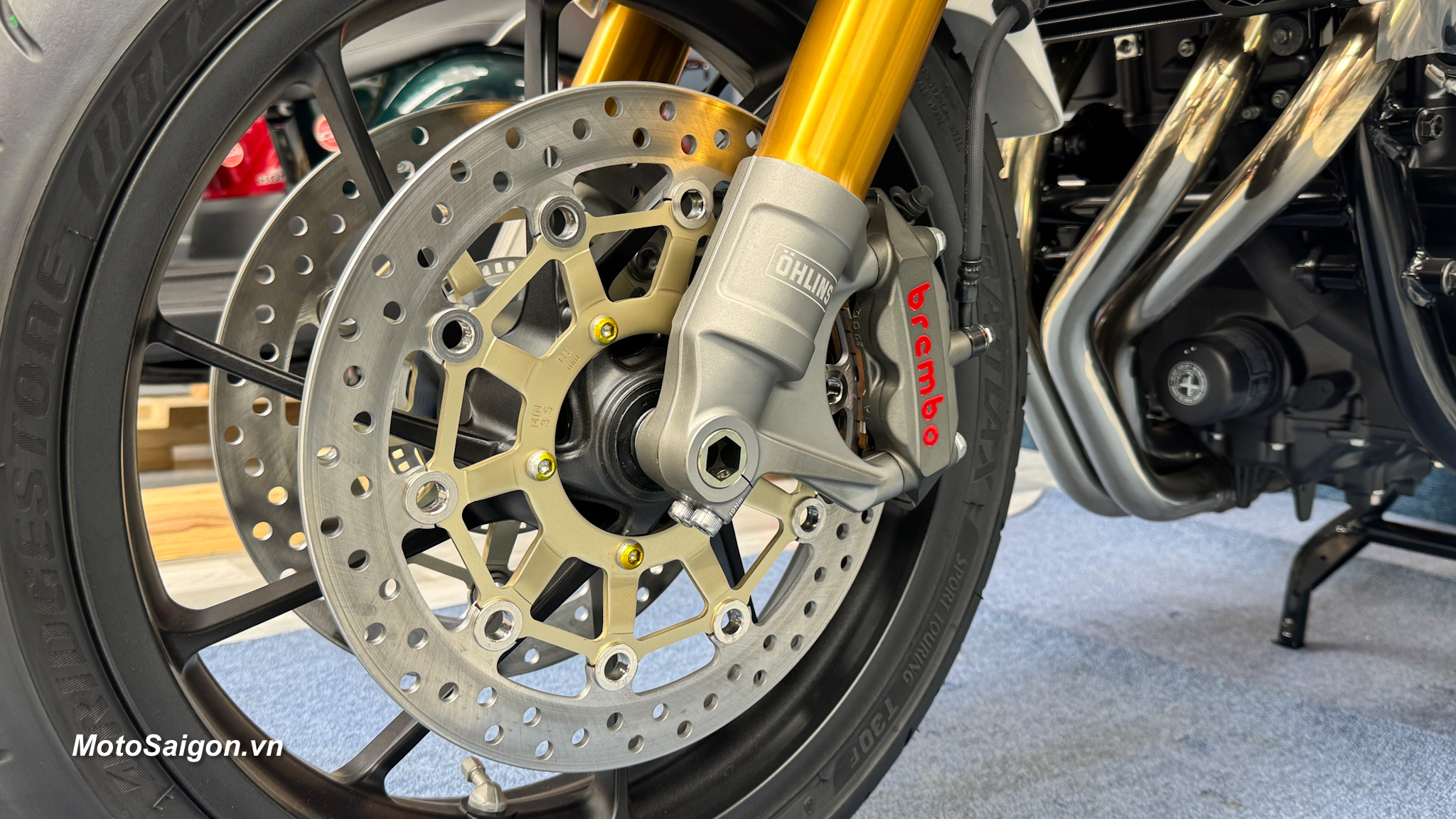 Hệ thống phanh Brembo: Cặp heo dầu Brembo 4 piston mạ vàng ở bánh trước, mang lại lực phanh mạnh mẽ và độ phản hồi chính xác.
