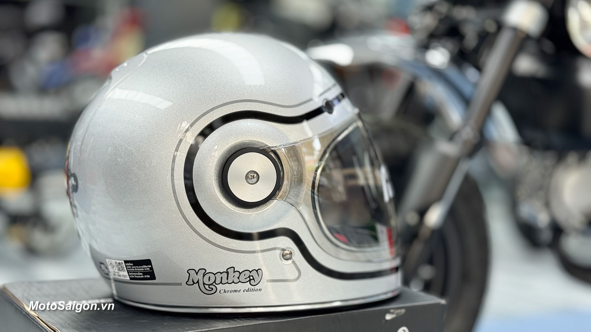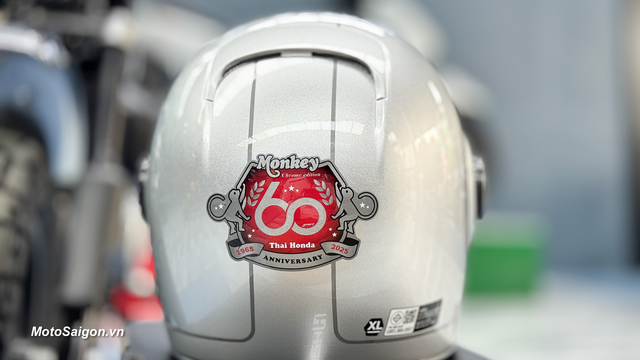 - Mũ bảo hiểm phiên bản đặc biệt: Kèm theo xe là một chiếc mũ bảo hiểm Silver Metallic được thiết kế riêng, mang cùng logo kỷ niệm 60 năm với biểu tượng “Double Monkey” và dòng chữ 60th Anniversary. Mũ bảo hiểm này không chỉ là phụ kiện an toàn mà còn là một món đồ thời trang, đồng bộ với phong cách của xe.