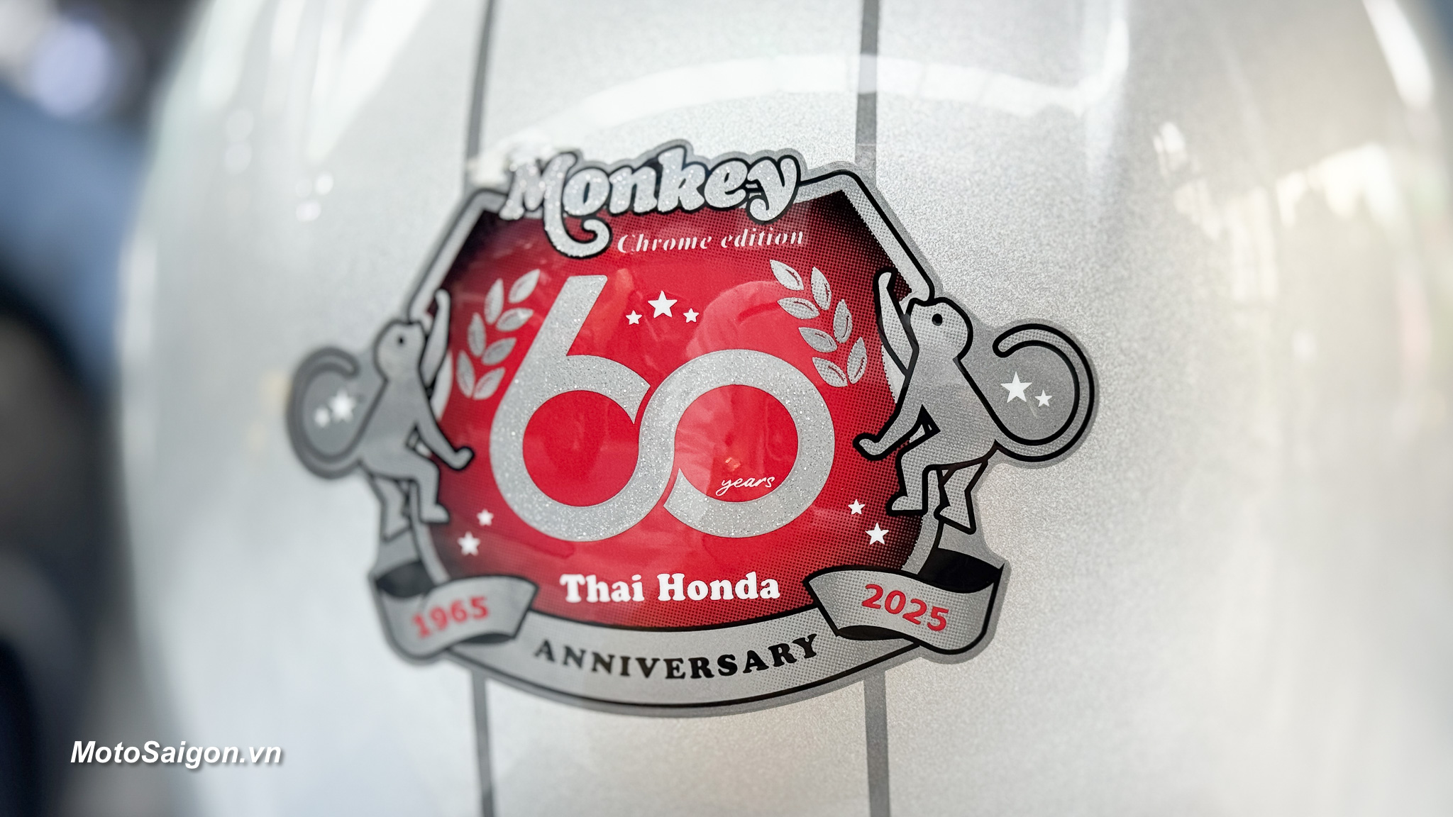 - Logo kỷ niệm độc quyền: Xe được trang trí logo Honda Wing cổ điển, kết hợp với biểu tượng “Double Monkey” – hai chú khỉ bạc 3D, gợi nhắc đến mẫu Monkey Z50 năm 1967. Logo kỷ niệm 60 năm Thai Honda được đặt ở nhiều vị trí như tấm chắn gió, thân xe và nắp bình xăng, tạo nên sự khác biệt và tính độc quyền.