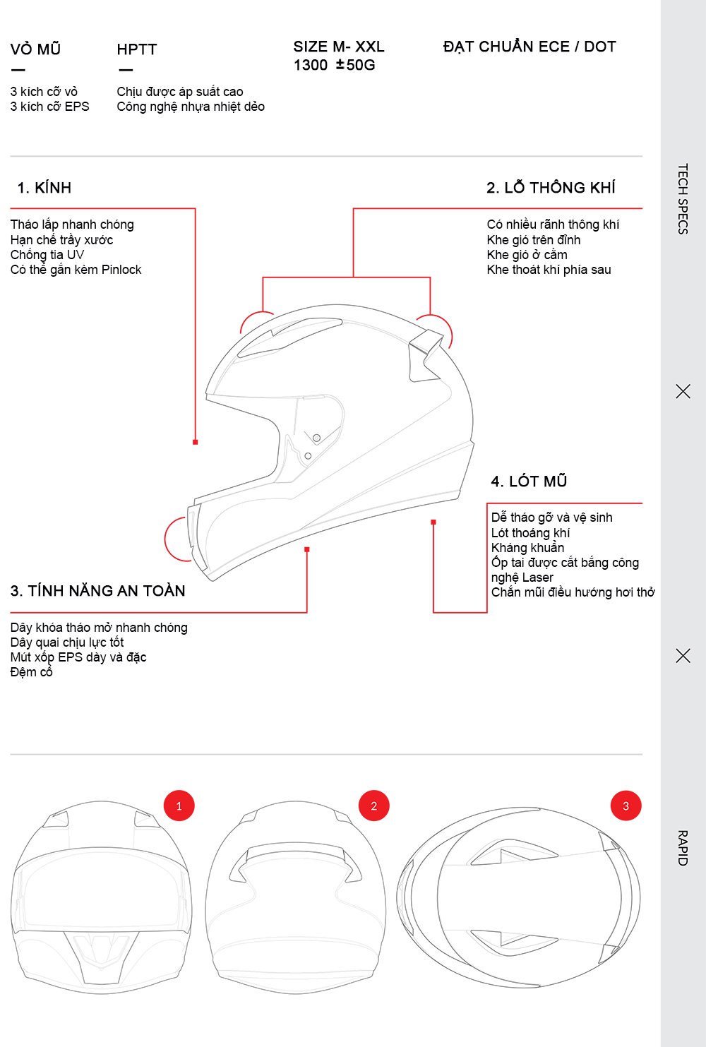 Rapid là sự kết hợp giữa khả năng bảo vệ cao với thiết kế đơn giản. Dòng mũ bảo hiểm mới này của LS2 được cấu tạo từ ABS nguyên sinh theo công nghệ ép HPTT mang lại kết cấu bảo vệ tối ưu với khối lượng tương đối nhẹ, 3 kích cỡ size vỏ, phần chắn mũi điều hướng hơi thở, kính chuẩn Class A với khả năng tháo lắp nhanh chóng. Chiếc mũ bảo hiểm này là lựa chọn hoàn hảo cho những chuyến đi nội thành và cũng cực kì thoải mái cho những chuyến đi tầm trung.
