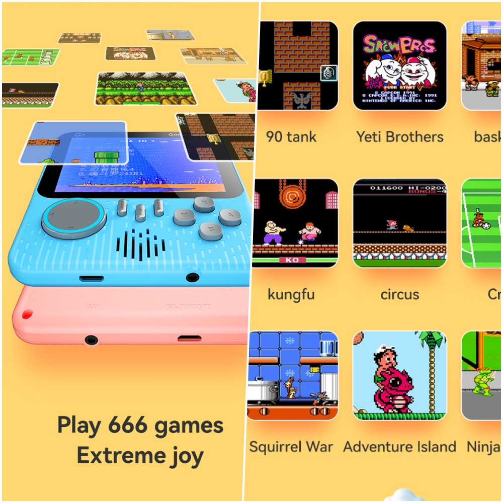 Với 666 trò chơi cài sẵn, bạn tha hồ trải nghiệm từ game huyền thoại tuổi thơ đến những pha hành động gay cấn. Có thể kết nối tay cầm phụ để chơi 2 người ngay trên máy, hoặc xuất hình lên TV qua cáp RCA để cùng nhau sống lại những kỷ niệm xưa.
