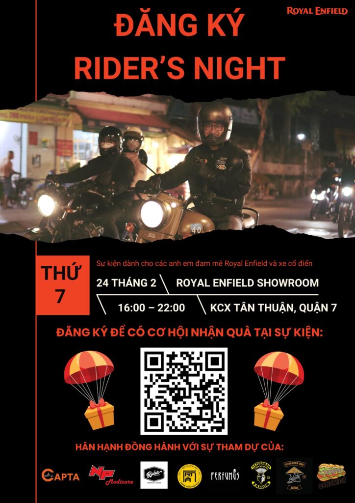 Hãy đăng ký ngay sự kiện Rider’s Night ngày 24/02/2024 này để được ưu tiên checkin tại sự kiện và có cơ hội nhận được những phần quà trúng thưởng may mắn đến từ Royal Enfield và các nhãn hàng đồng tài trợ nhé!