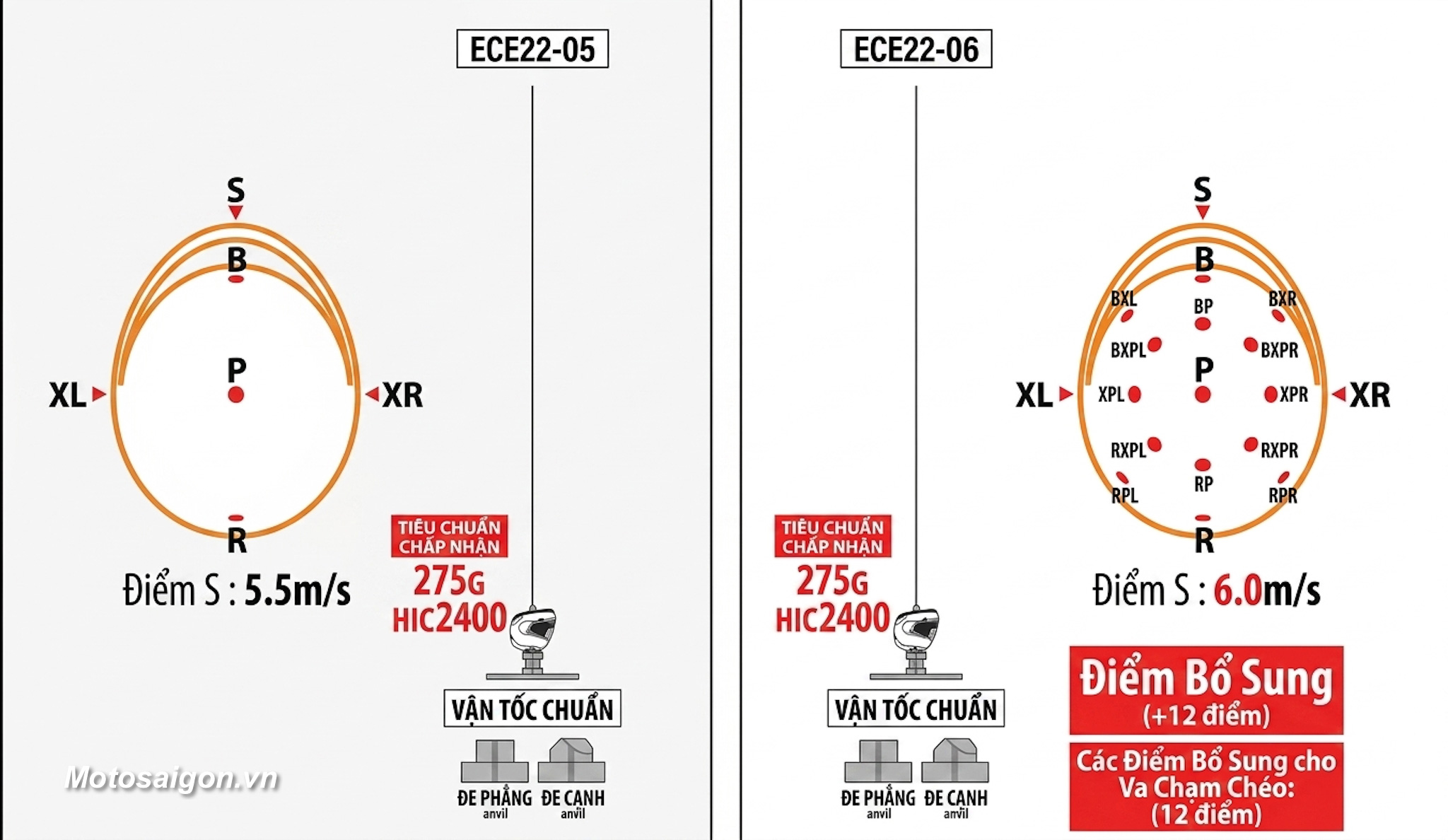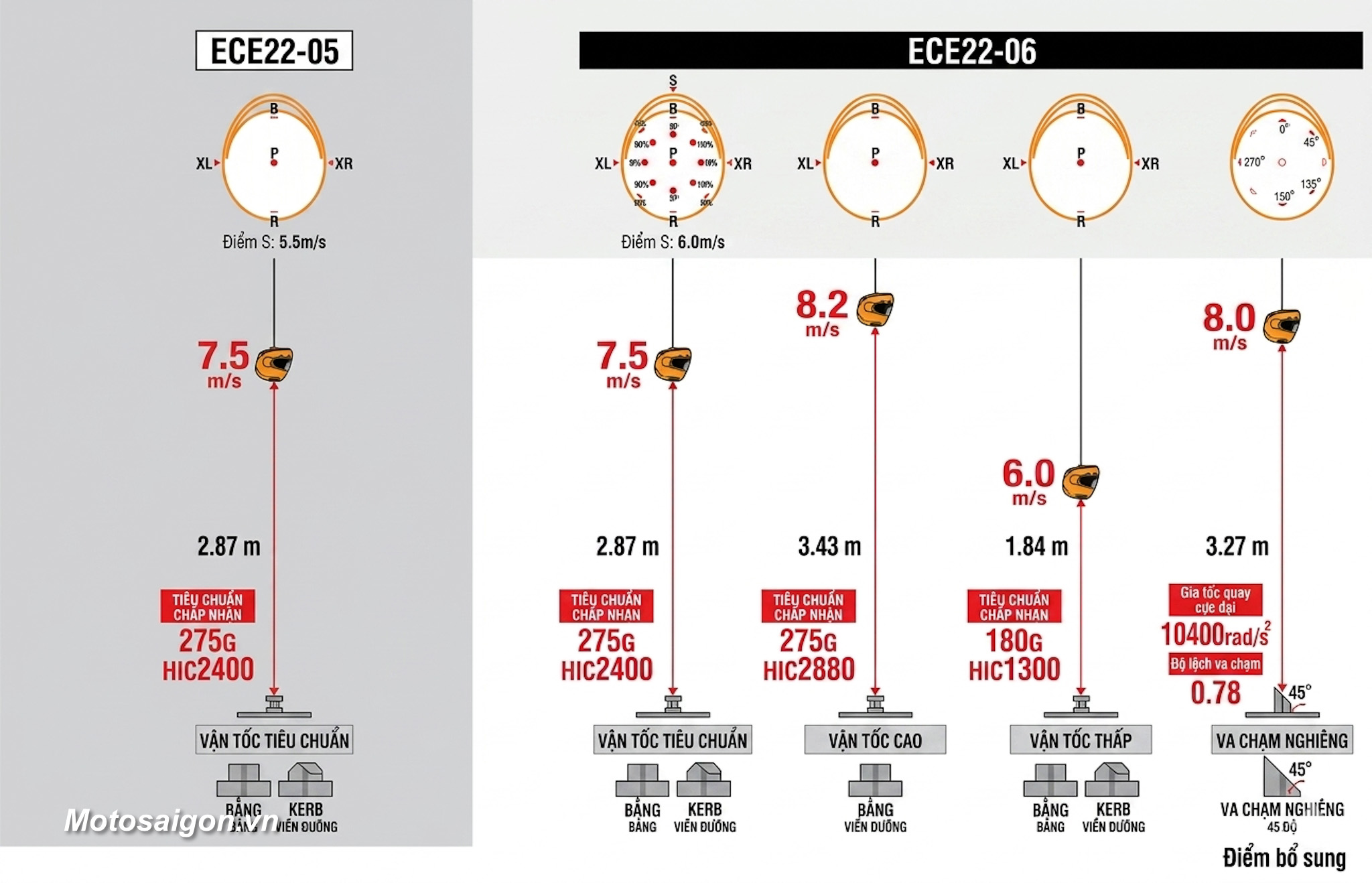 • Theo Motosaigon được biết, ECE 22.06 không còn kiểm tra đâm thủng (penetration) như cũ, nhưng tập trung mạnh hơn vào hấp thụ năng lượng và ma sát bề mặt.
