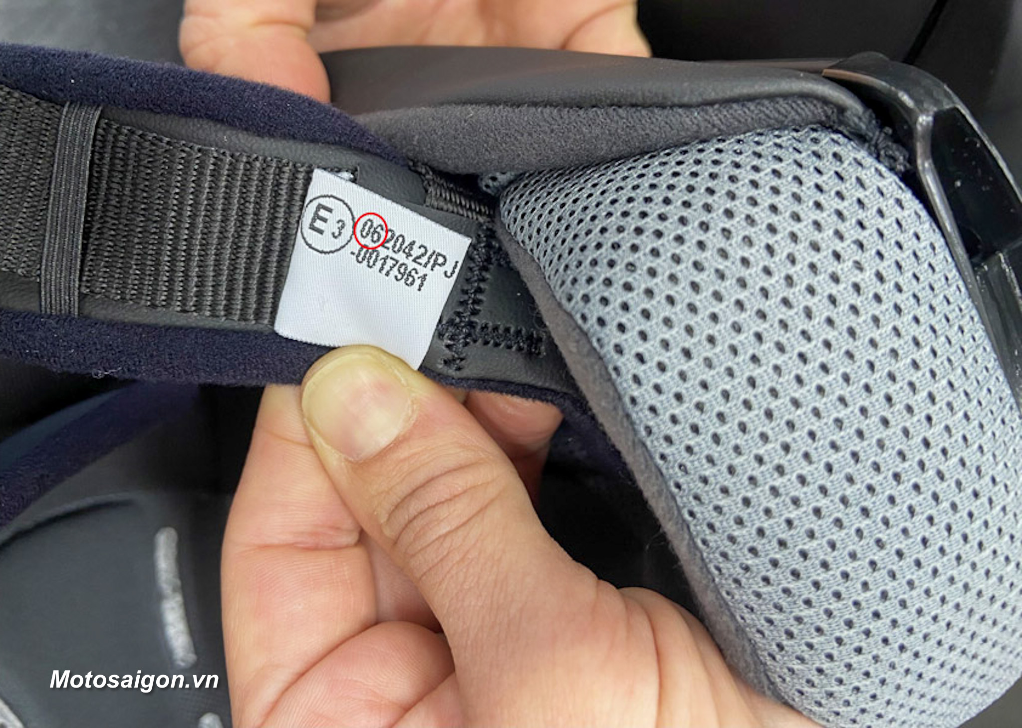 • Nhãn bên trong (thường trên dây cằm hoặc lót): Có biểu tượng E trong vòng tròn + số quốc gia chứng nhận (ví dụ: E11 = Anh, E1 = Đức, E3 = Ý…). Theo sau là chuỗi số dài, trong đó có 06 chỉ phiên bản chuẩn.