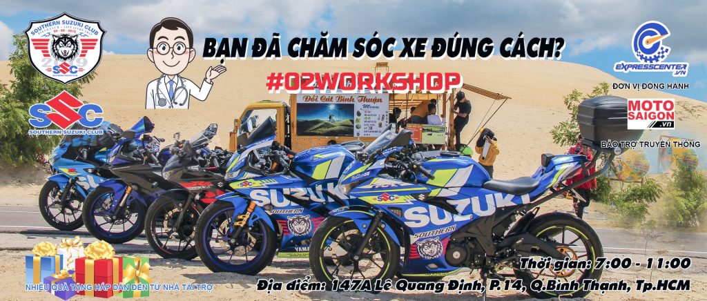 Sau sự thành công của WorkShop lần đầu tiên, CLB Suzuki Miền Nam SSC (Southern Suzuki Club) kết hợp cùng Trung tâm dầu nhớt ExpressCenter.vn và MotoSaigon tiếp tục tổ chức buổi Workshop SSC lần thứ 2 với chủ đề: “Bạn đã chăm sóc xe đúng cách?”.